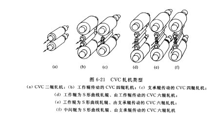 CVC軋機分為CVC二輥(gǔn)軋機、CVC四輥軋機和CVC六輥軋機三種,輾係示意圖如圖6-21所示。CVC四輥軋機的工作輥為S形曲線軋輥,而CVC六輥軋機的(de)S形曲線軋輥可(kě)以