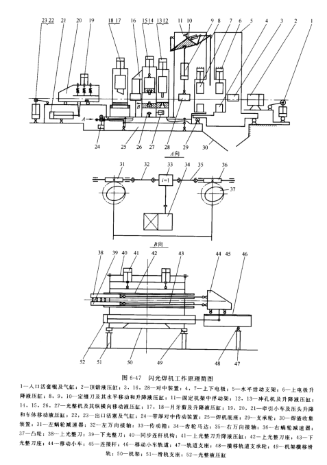 閃光焊機由電機及焊接裝置,焊縫(féng)定位裝置,帶鋼與機(jī)組線對中裝置,衝孔裝置,光正裝置,月牙剪,帶(dài)鋼板厚對中裝置機焊(hàn)渣收(shōu)集裝置(zhì)組(zǔ)成,圖6-47所(suǒ)示為閃光焊機工(gōng)作原理簡圖。