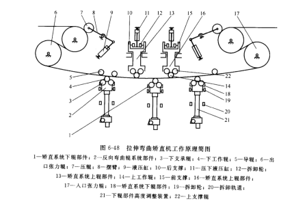 圖(tú) 6-48 所示(shì)為拉伸彎曲矯直機工作(zuò)原理簡圖。拉伸彎曲矯直機由張力輥及張力輥主傳動裝置(zhì)、壓輥裝置(zhì)、上矯直輥裝(zhuāng)置和下矯直輾裝置(zhì)組(zǔ)成。