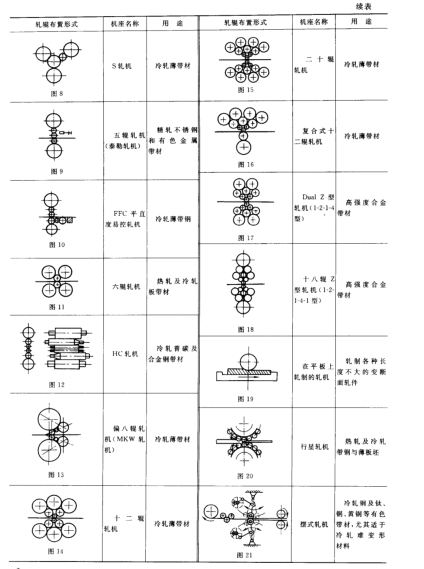 (10)Z型軋機(見表1-2中圖17、圖18) 它是(shì)由多(duō)輾軋(zhá)機變化而來。由於改變了工作(zuò)輥輥徑,為控製(zhì)板形提供了良(liáng)好的條件。