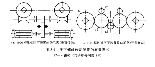 ②采用圓柱齒輪平行傳(chuán)動方案。立式電動機上的小齒輪 17 【圖 3-4(b)】 分別通過中間大惰輪 13 帶(dài)動固定在方孔套筒6 上的大齒輪 7,而使壓下(xià)螺絲在螺母 3中旋轉(zhuǎn)並實現(xiàn)上下移動。