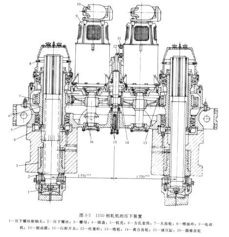 為(wéi)實現兩個壓下螺絲(sī)同步移動,以保持上輥的平行升降,兩個大惰輪 13 之間用一個離合齒輪 14相(xiàng)連。離合齒輪通過(guò)兩個滾動軸承裝在(zài)液壓缸 15 的柱塞(sāi)杆 12 上,在液壓推動下,當柱塞升起時切斷與兩中間惰輪之間(jiān)的聯係,即可實現兩個(gè)壓下螺絲的單獨調整。傳(chuán)動齒輪總(zǒng)速比為4.5,壓下螺絲的直徑和螺距為 440×48mm。壓下螺絲的移動量是(shì)用指針盤反映給操作台,指(zhǐ)針通過單獨的齒輪傳動與中(zhōng)間惰輪軸(zhóu)上的(de)圓錐齒輪 16相連。